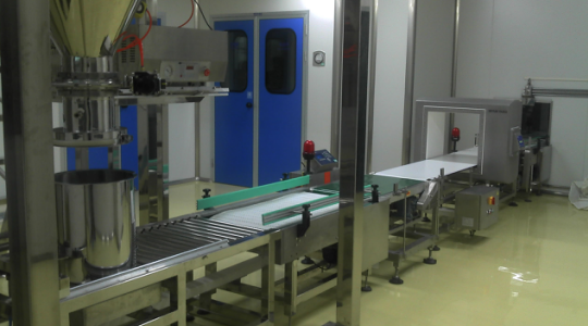 將口服原料藥經(jīng)過混合后進(jìn)行袋裝(無塵)、復(fù)稱、熱合、重檢、金檢以及傳遞和包裝的一整條系統(tǒng)